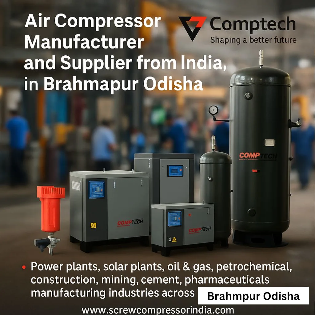 “Supporting Brahmapur’s industries, Comptech delivers energy-efficient compressed air systems for textiles, seafood, cashew, rice mills, agro, food, pharma & MSMEs.”
